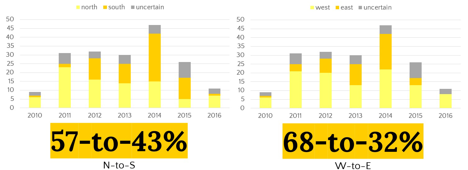 SEPs appear mostly in northern hemisphere before the maximum of solar cycle 24 and prefer southern hemisphere after the solar maximum (Figure 3 left plot). Moreover, we obtain that nearly 68% (103/152) of the proton sample originate from the western heliolongitudes, whereas the remaining 32% (49/152) are from the eastern (Figure 3 right plot). These percentages confirm the well-known observation for the preferential western origin of in situ observed particles.