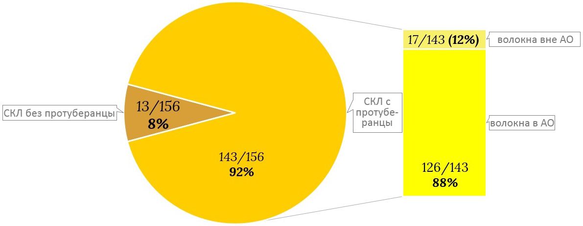 Из нашего списка 143/156 протонные события были связаны с протуберанцами (92%), тогда как в остальных 13/156 случаях (8%) связь протуберанцев не была установлена (рис. 1). Протон-ассоциированные протуберанцы и волокна наблюдались в активных областях (АО) в 88% случаев. Только 17 (около 12%) из 143 случаев протуберанцев, связанных с солнечных энергетических частиц, не связаны с АО.